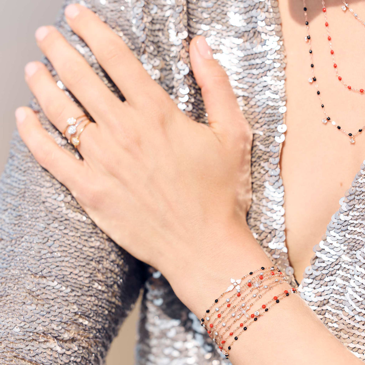 • Photo d’un poignet portant plusieurs bracelets de différentes couleurs et modèles Gigi Clozeau.