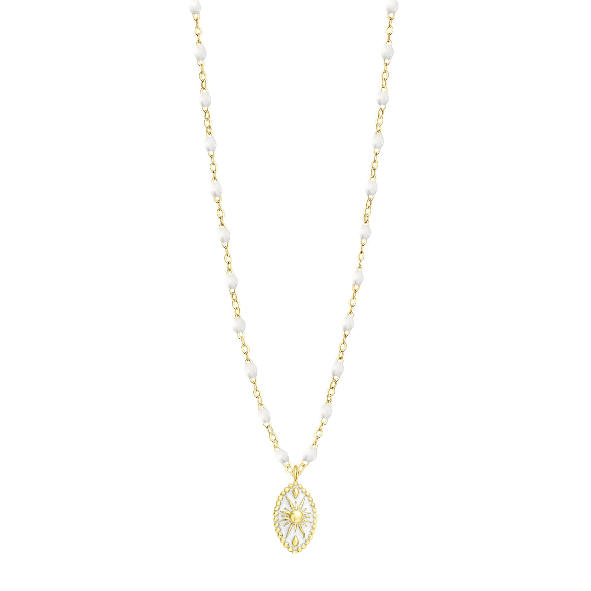 The Gigi Clozeau Karma necklace in 18 carat yellow gold on a Classic Gigi chain, with elegant, White pearls of resin. The perfectly placed, detailed pendant is a precious talisman, offering light and protection.