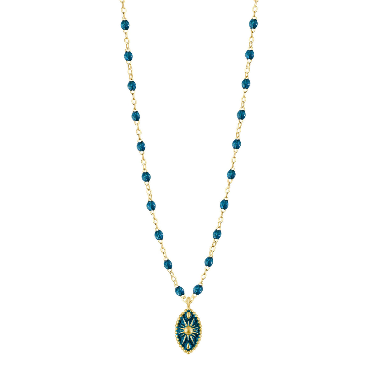 Le Collier Karma gigi Clozeau en or jaune 18 carats se dévoile sur la chaîne classique gigi, ponctuée d’élégantes perles de résine jungle. Son pendentif au contour finement perlé incarne un talisman précieux, à la fois protecteur et lumineux.